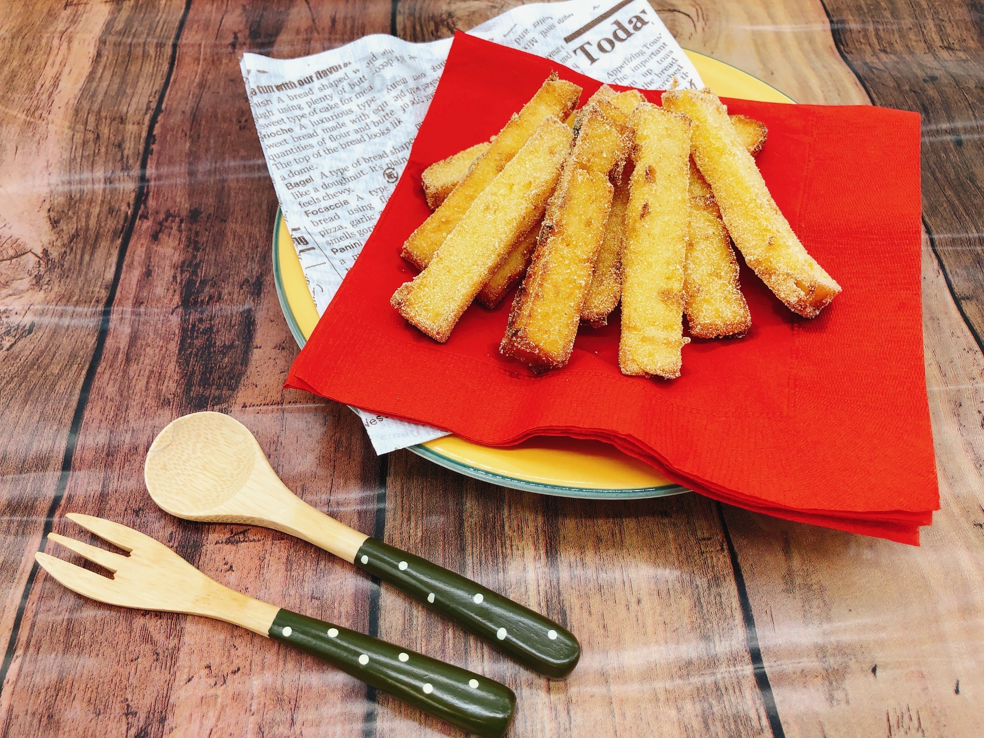 固めに仕上げたポレンタは、平バットなどに流して冷やした後、細くカットし油で揚げるとスナックになります。