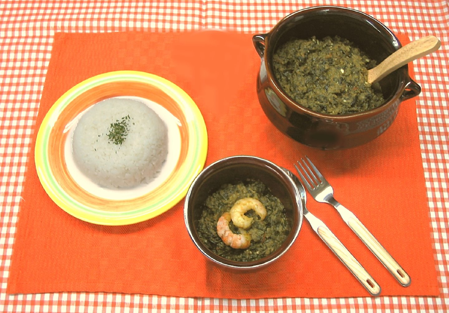 ココナツとエビのシチューに粉を加えて、クリーム状にするお料理ですが、元々のアフリカではコーン・ミールやガリと呼ばれるキャッサバの粉末を加えのが一般的。一方のブラジルでは、やはりコーン・ミールやファリーニャ・デ・マンジョッカと呼ばれる粉末キャッサバはもちろん小麦粉も使いますし、パン粉(細挽)を使うこともあるといいます。